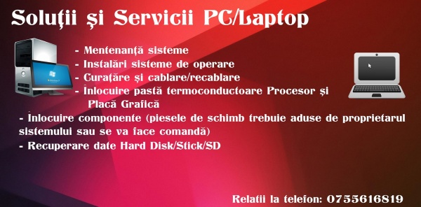 Tanar student cu o experienta de 5 ani in domeniu ofer servicii IT la domiciliul clientului cu deplasare gratuita si preturi accesibile. Pachet 50 de lei: -Instalare Windows XP / 7 / 8 / 10 / cu toate driverele necesare pentru functionarea optima al calculatorului -Instalarea de programe necesare si utilitare ( Google chrome, Adobe Flash Player, Skype, Daemon tools, Itunes, Java, Team Viewer, uTorrent, VLC, Microsoft Office, + orice program cerut de client) -Instalare Antivirus -Copierea datelor pentru a nu fi pierdute in timpul instalarii Windows-ului(poze, date, etc). Oferta 70 de lei + plus curatare praf si inlocuire pasta termoconductoare PC Oferta 120 de lei + plus curatare praf si inlocuire pasta termoconductoare LAPTOP Alte servicii: -recuperare date prierdute sterse -instare jocuri -devirusare -optimizare -recomandare piese pentru upgrade Ofer garantie 30 de zile! Pentru alte detalii sunati-ma sau lasati un mesaj si voi raspunde cat mai repede.